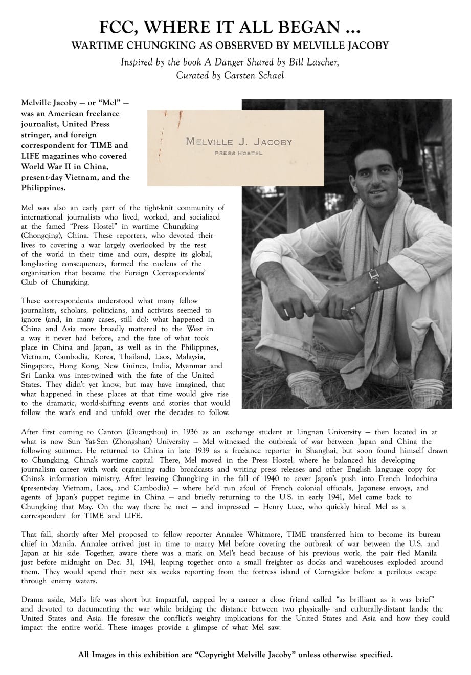 A photo exhibition at the FCC throughout April uses wartime photographs taken by American reporter Mel Jacoby to illustrate those dangerous first years of the Club, then known as the Press Hostel. Please come and see it if you are in Hong Kong this month. These photos of daily life amid conflict remained unseen until they were published for the first time last year. The exhibition is on the walls of the Main Bar, on the ground floor at 2 Lower Albert Road in Central.